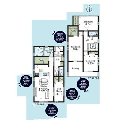 | 設備 | システムキッチン 床下収納 モニタ付インターホン ディンプルキー 浄水器 浴室乾燥機 追焚機能 シャワー付洗面化粧台 人感センサー付照明 ダウンライト 照明器具 | ||
